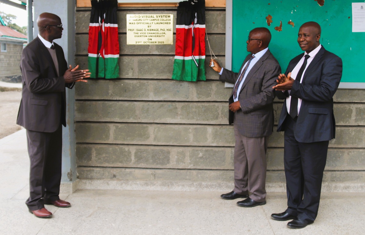From Right: Prof. George Morara Ogendi, Egerton University Vice-Chancellor Prof. Isaac Kibwage, and Prof. Samson Orondo Obure during the launch of state-of-the-art audio-visual equipment at Nakuru City Campus College.