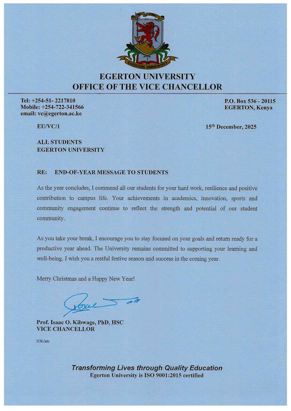 End-of-Year Message to Students 18 December 2025 The Vice Chancellor shares his end-of-year wishes with all students as the year comes to a close.