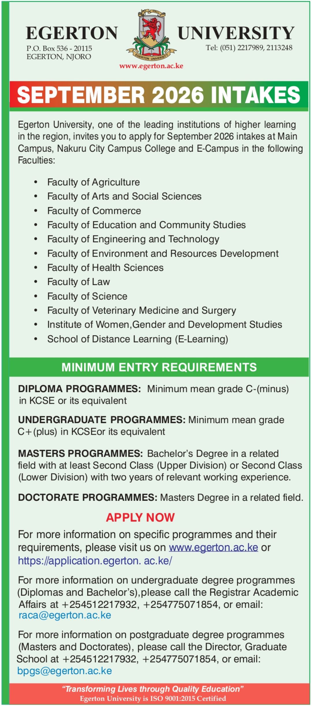 Egerton University, one of the leading institutions of higher learning in the region, invites you to apply for September 2026 intakes at Main Campus, Nakuru City Campus College and E-Campus in the following Faculties:• Faculty of Agriculture, Faculty of Arts and Social Sciences, Faculty of Commerce, Faculty of Education and Community Studies, Faculty of Engineering and Technology, Faculty of Environment and Resources Development,Faculty of Health Sciences,Faculty of Law, Faculty of Science,Faculty of Veterinary Medicine and Surgery,Institute of Women,Gender and Development Studies ,School of Distance Learning (E-Learning).