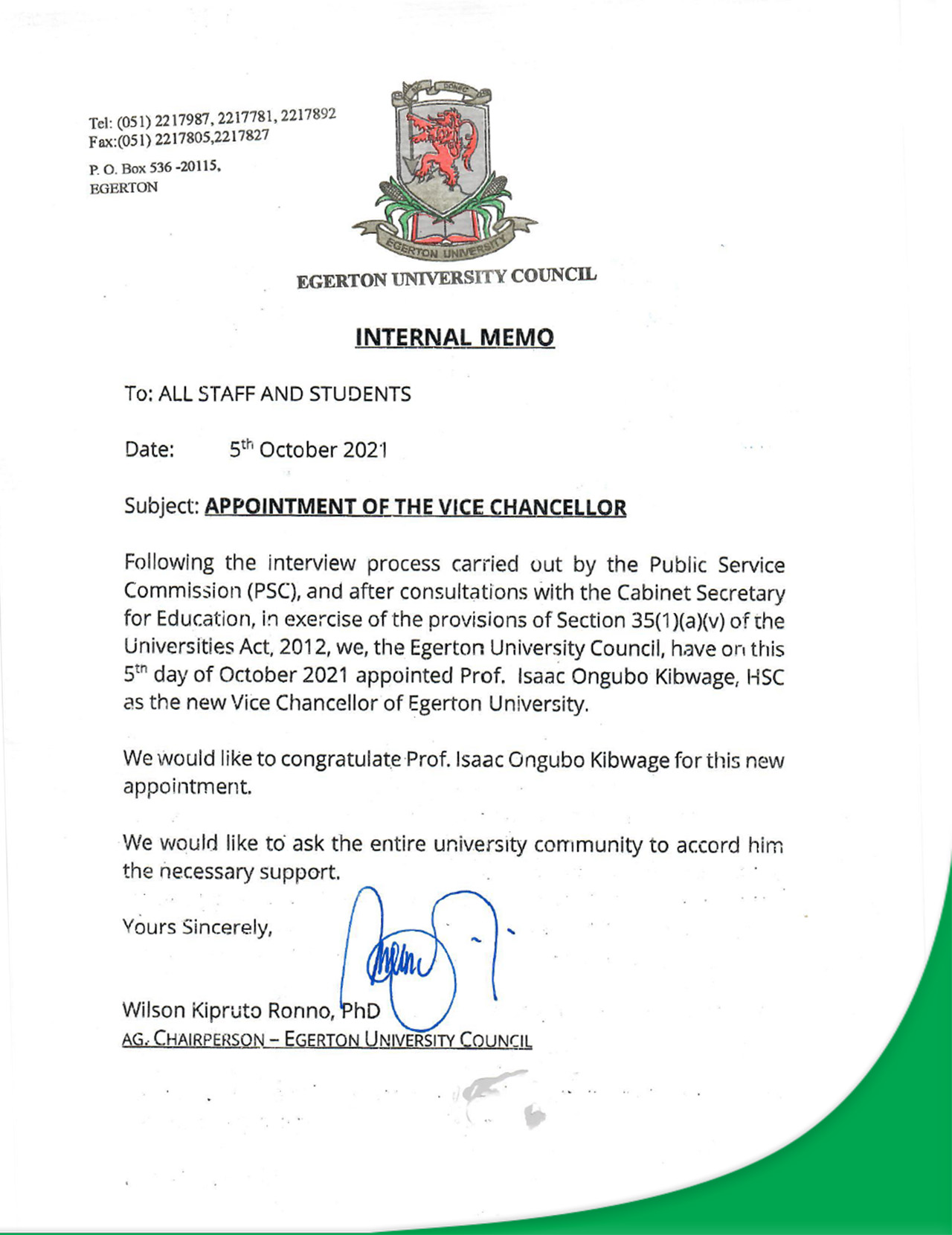 Following the interview process carried out by the Public Service Commission (PSC) and after consultation with the Cabinet Secretary for Education, in exercise of the provisions of Section 35(1)(a)(v) of the Universities Act, 2012, we, the Egerton University Council, have on this 5th Day of October 2021 appointed Prof. Isaac Ongubo Kibwage, HSC as the new Vice-Chancellor of Egerton University.