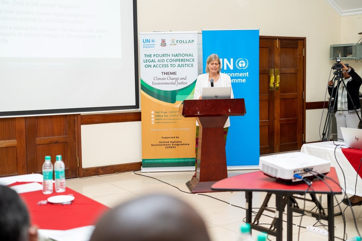 Prof. Dr. Gudrun Zagel from Paris-Lodron University Salzburg presents on climate justice through climate litigation at the Egerton University 4th Faculty of Law Conference in Naivasha, Kenya, on October 23, 2024, highlighting recent European Court of Human Rights rulings that emphasize state accountability in climate action. (Photo by Kurian Musa/Egerton University)